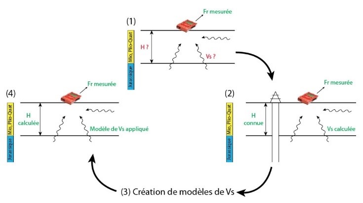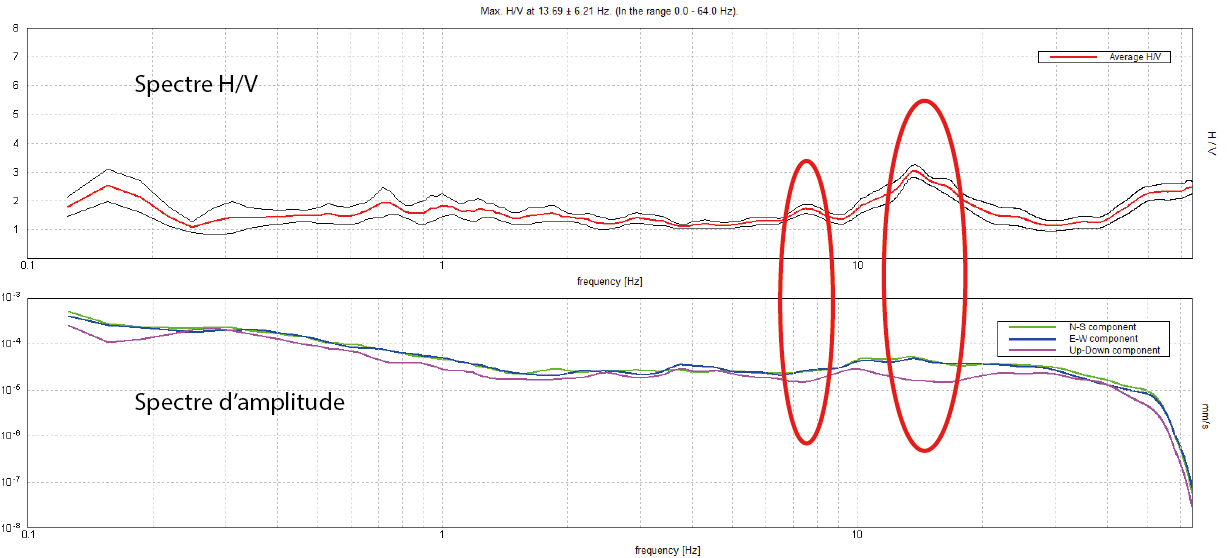 La technique H/V repose sur l’analyse du bruit sismique ambiant (vibrations naturelles ou d’origine anthropique) afin d’identifier les variations d’impédance entre les différentes couches géologiques. Elle permet notamment d’estimer l’épaisseur des formations superficielles reposant sur le substratum, paramètre clé pour l’analyse des zones karstifiées.